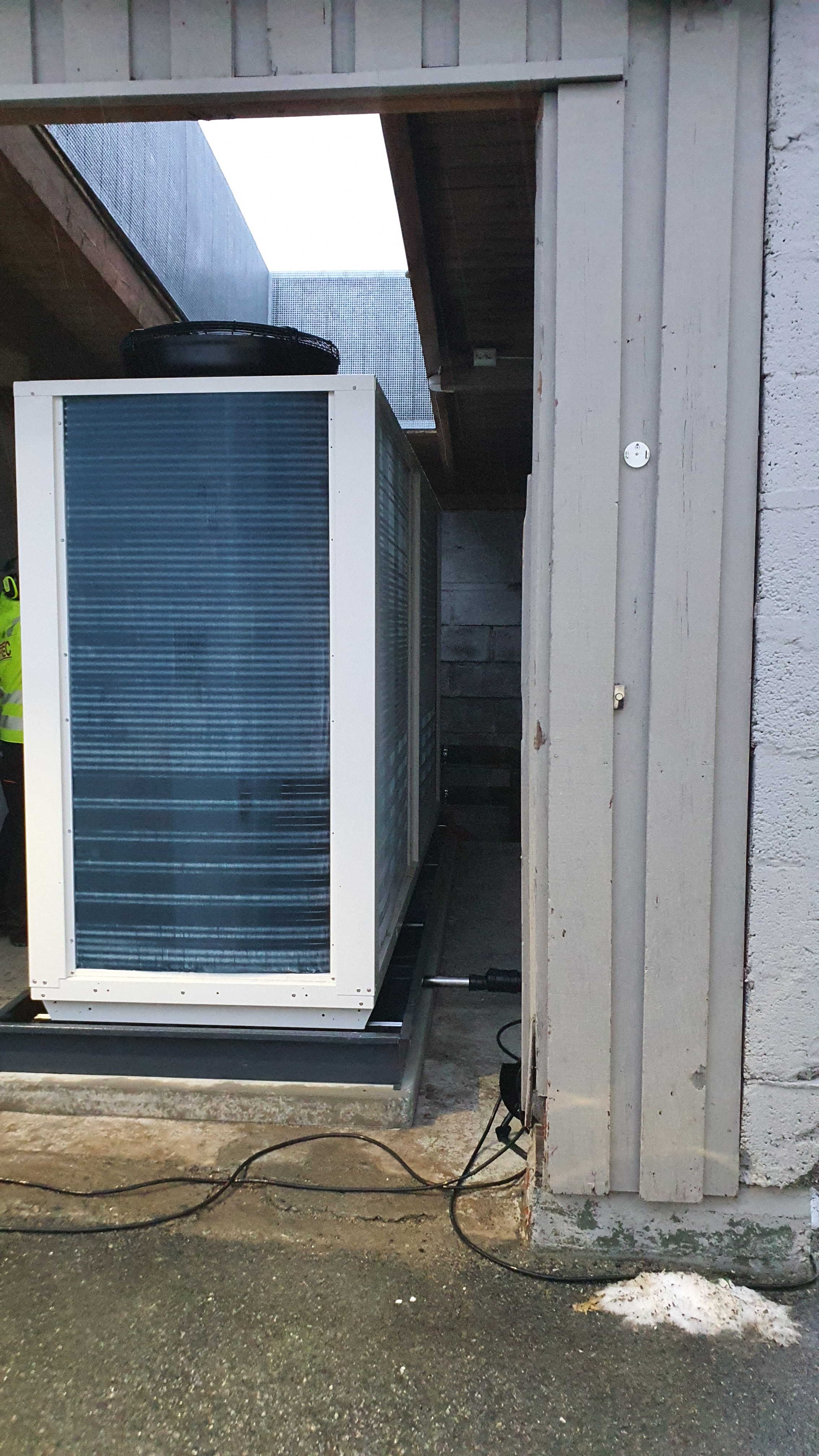 01.12.2024: Neste store milepæl kommer på plass. Vi installerer varmepumpe for å ta hånd om oppvarmingen. Det er en luft til vann pumpe som avgir opptil 150 kW varme med et forbruk på rundt 50 kW. Utfordringen ved en så stor maskin midt i byen kan jo være støyforurensning. Vi har valgt en “Low Noise” utgave. I tillegg er den satt inne i en garasje med åpninger vekk fra naboer for å fjerne resten av støyen.